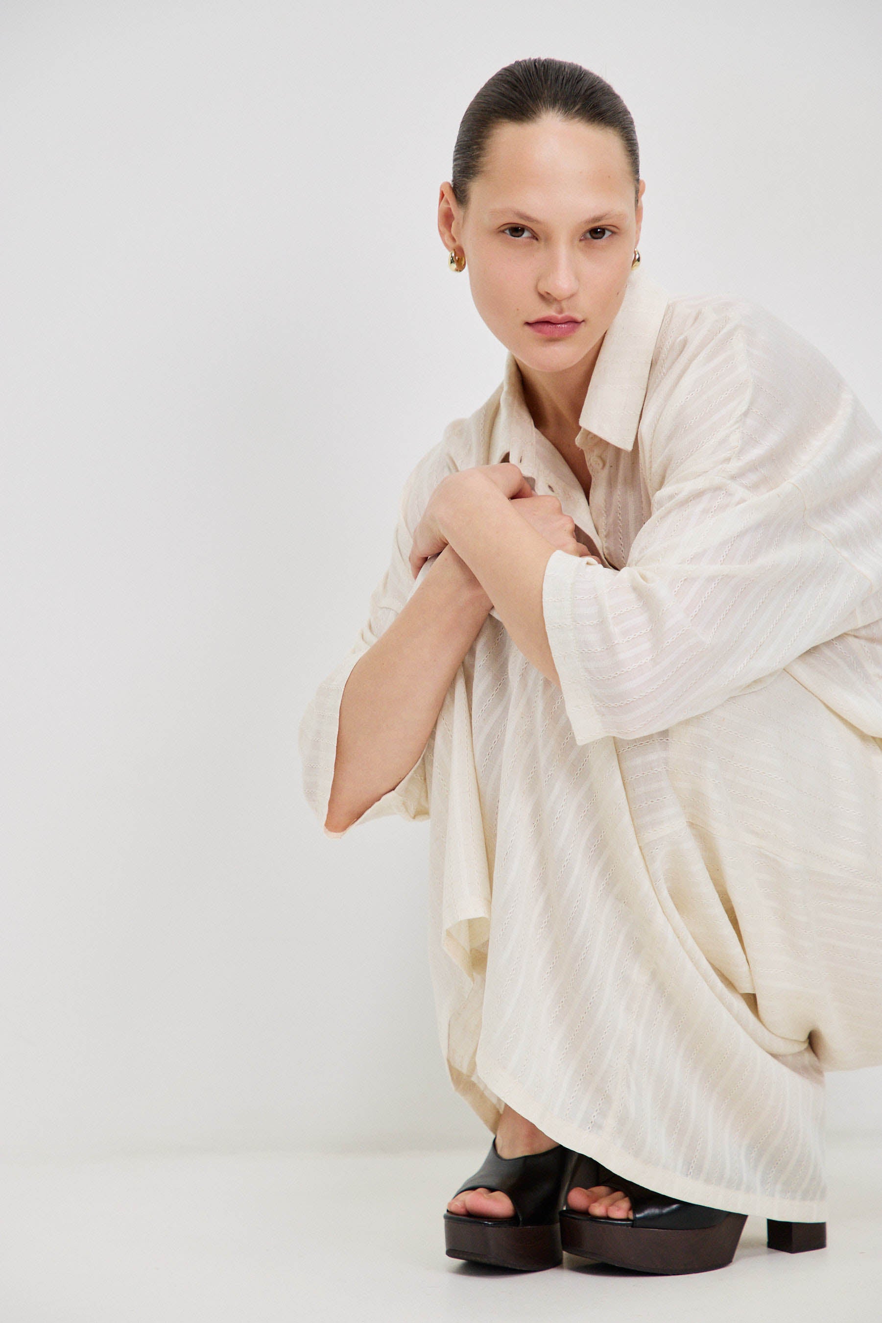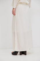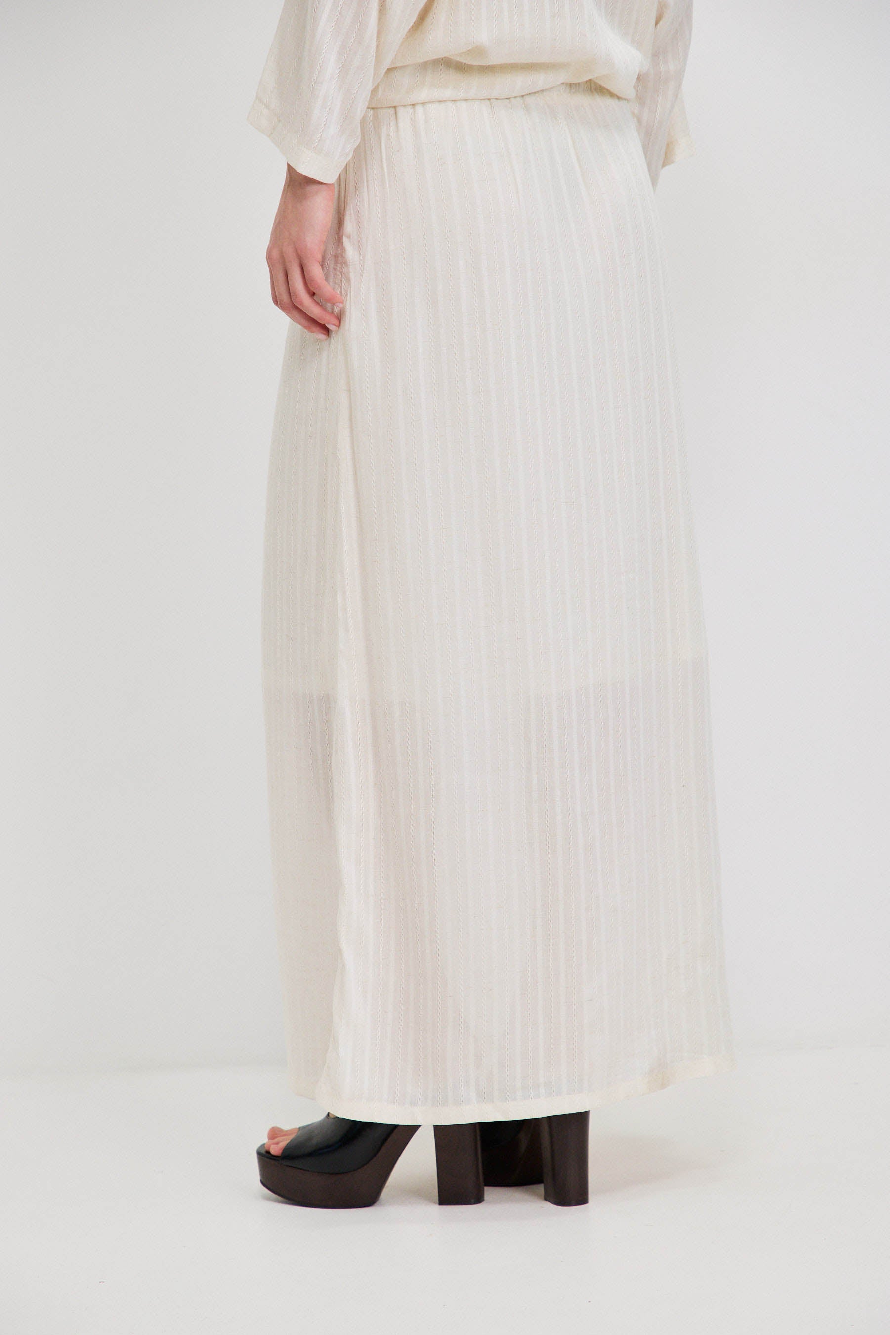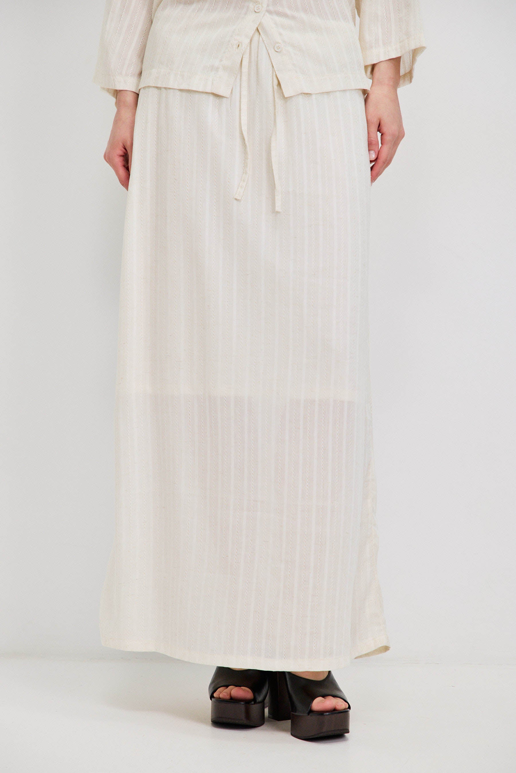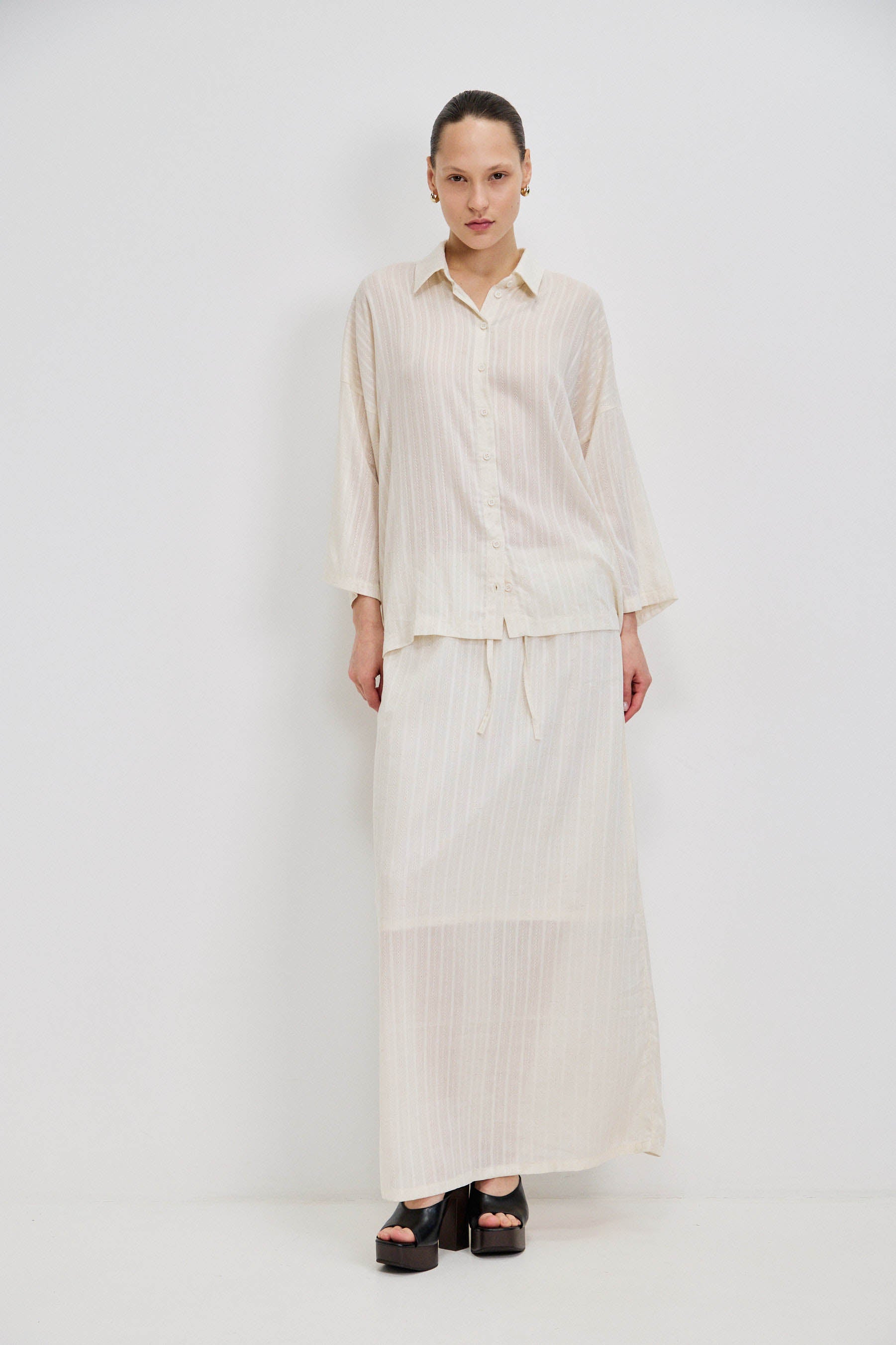 חצאית מקסי עשויה בד וואל רקום, בעלת מראה קליל עם שקיפות עדינה. כוללת בטנה עד אורך הברך, וגומי דק בקו המותן עם שרוך להתאמה נוחה ומדויקת. יוצרת תנועה רכה ומאוזנת על הגוף. משתלבת באופן טבעי עם חולצת נאיה להשלמת הסט.