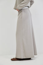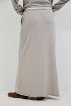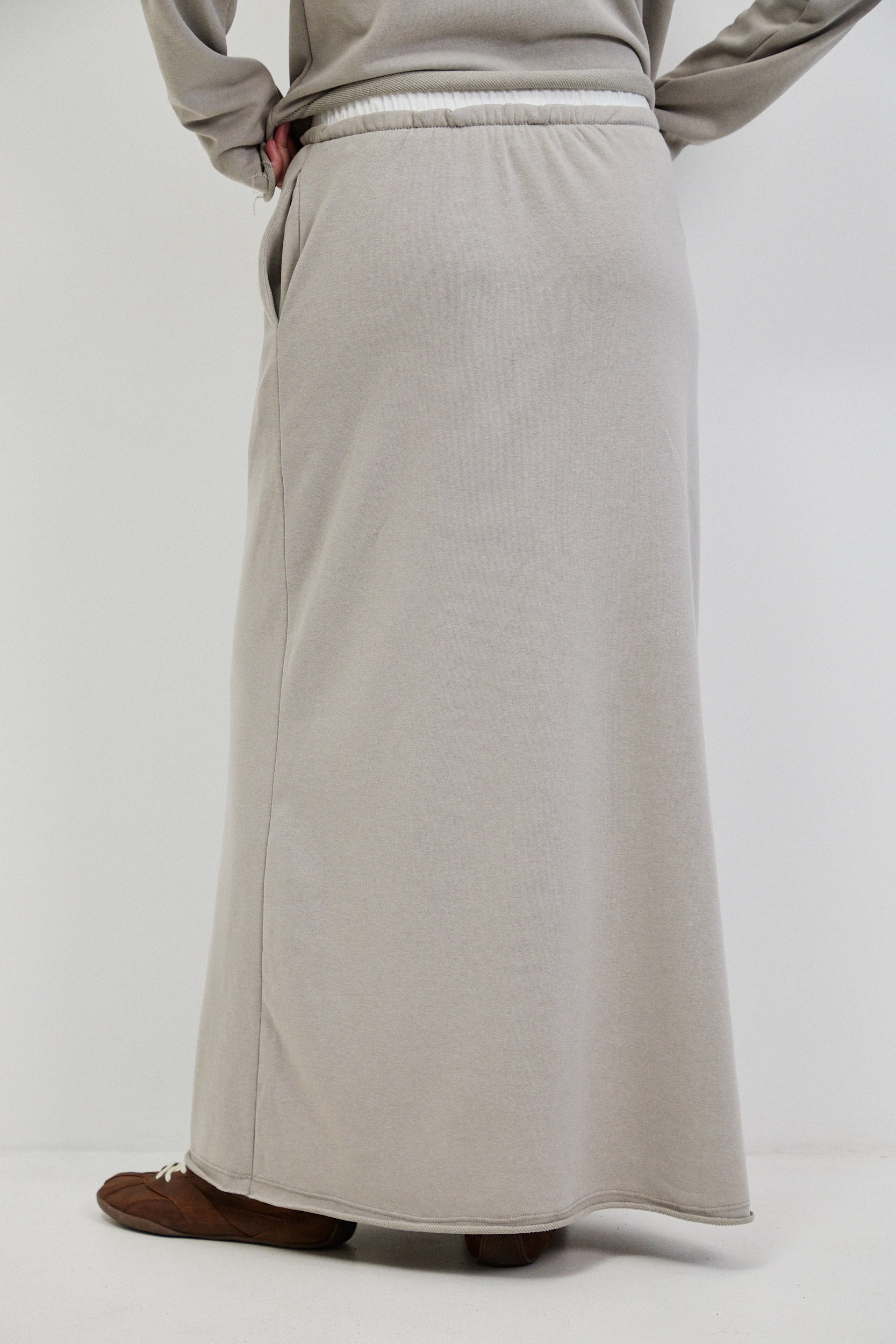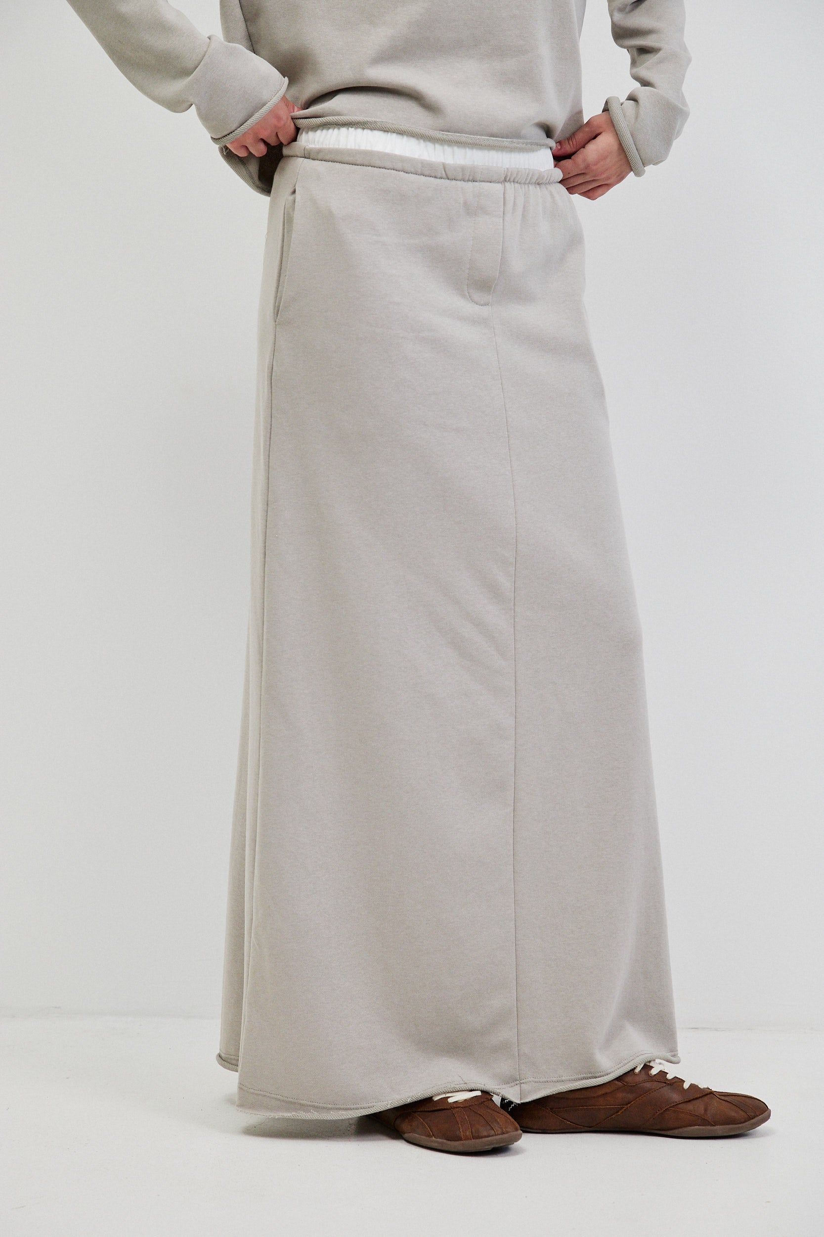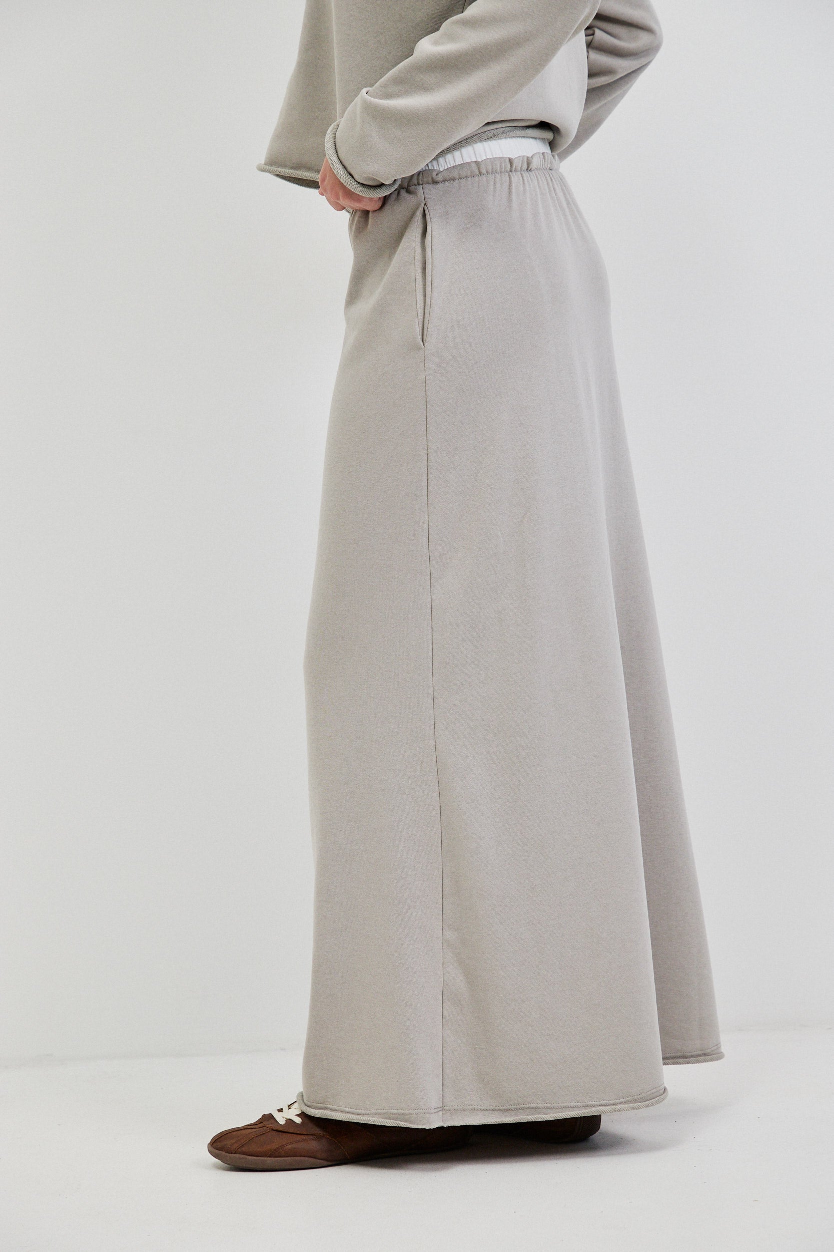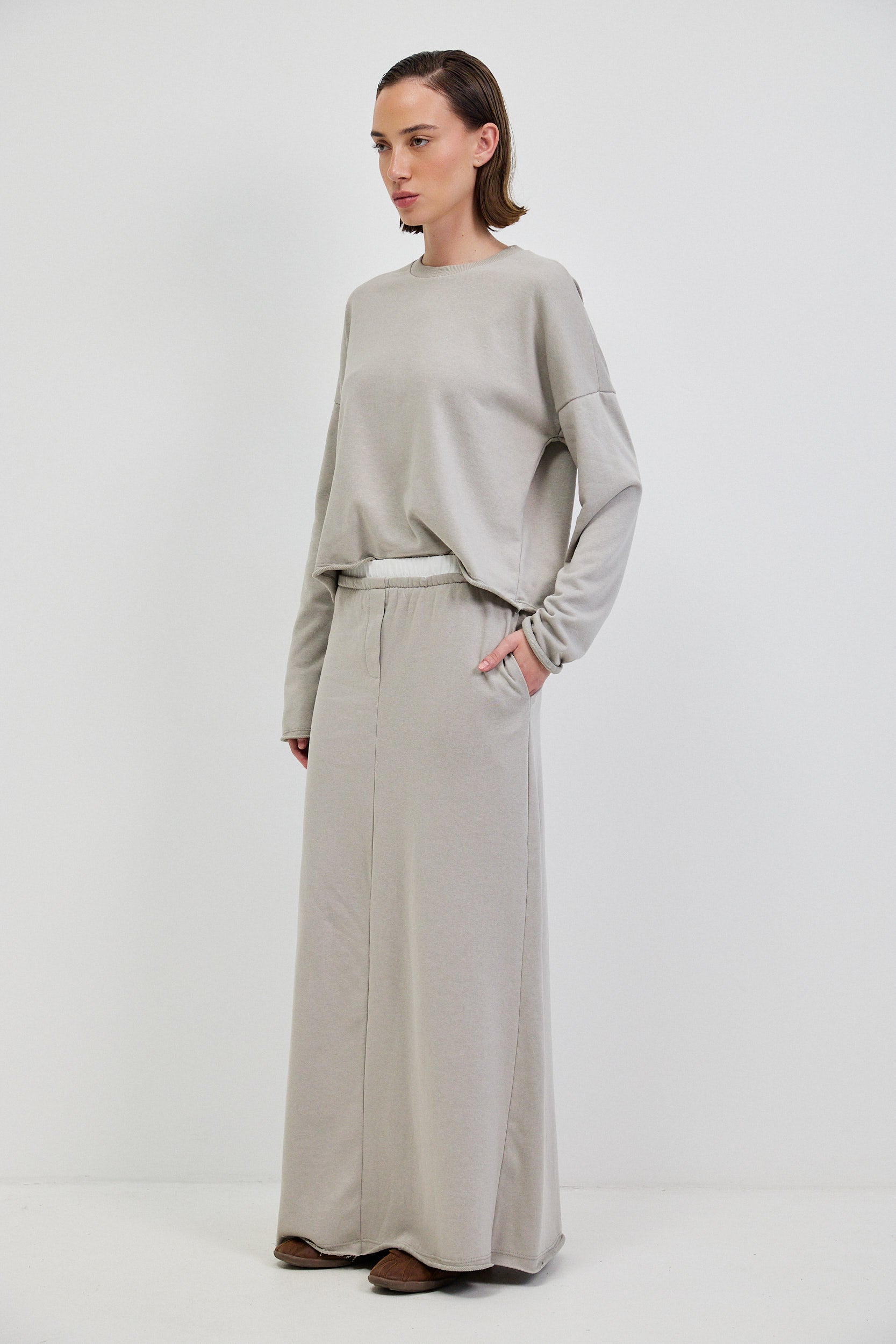 חצאית מקסי מבד פרנץ’ טרי רך בגוון אפור בהיר, עם חגורת מותן אלסטית עבה ולבנה, כיסי צד מינימליסטים, תפר עליון מרכזי וקו תחתון גולמי שמעניק טאץ’ טבעי ולא מתאמץ. פריט יומיומי נעים ומדויק.